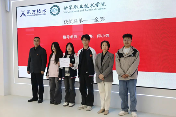 由沙红梅、闫小强老师指导的玛伊热·柯尤木、丁慧茹、李冰团队凭借出色表现取得金奖。伊犁职业技术学院教务处处长陈辉江处长为他们颁奖,现场响起热烈掌声。